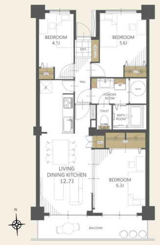 | 専有面積 | 壁芯 64.05㎡ | バルコニー面積 | 8.91㎡ |
