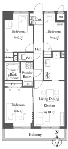 | 専有面積 | 壁芯 62.72㎡ | バルコニー面積 | 6.72㎡ |