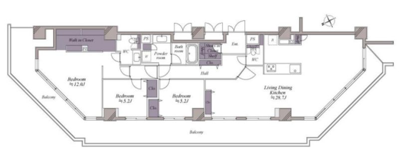 | 専有面積 | 壁芯 124.09㎡ | バルコニー面積 | 34.07㎡ |