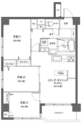 | 専有面積 | 壁芯 61.83㎡ | バルコニー面積 | 5.02㎡ |