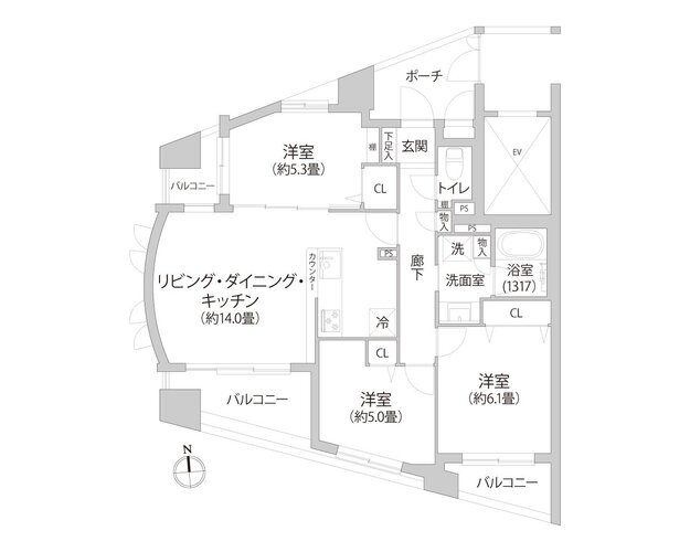 | 専有面積 | 壁芯 68.34㎡ | バルコニー面積 | 12.4㎡ |