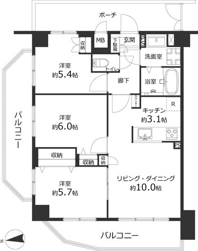 | 専有面積 | 壁芯 64.8㎡ | バルコニー面積 | 17.85㎡ |