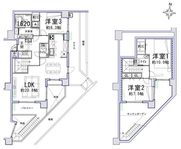 専有面積111m2超、テラスとサンクンガーデン付き南東角部屋メゾネット住戸