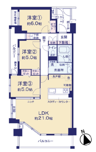| 浴室・トイレ・洗面所 | 浴室乾燥機 / 温水便座洗浄機 / 三面鏡 | バルコニー | 2面バルコニー |