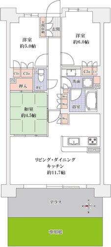 | 設備 | 全居室収納あり / テラス / 専用庭 / CATV | その他 | リノベーション / リフォーム / フラット35適用 |