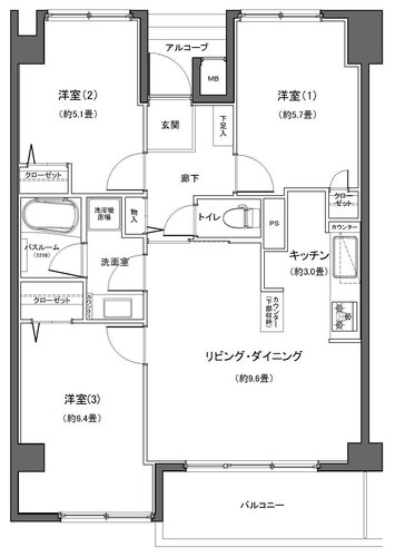 | 専有面積 | 壁芯 62.0㎡ | バルコニー面積 | 6.0㎡ |