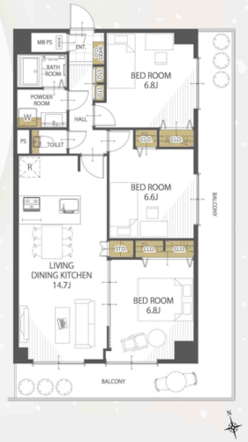 | 専有面積 | 壁芯 72.45㎡ | バルコニー面積 | 18.8㎡ |