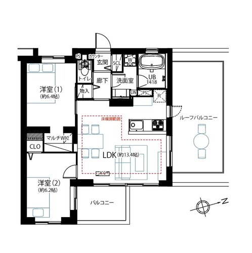 2LDK + ルーフバルコニー+WIC/58.22㎡