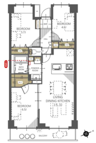 | 専有面積 | 壁芯 66.0㎡ | バルコニー面積 | 7.44㎡ |