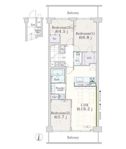 | 専有面積 | 壁芯 80.76㎡ | バルコニー面積 | 17.4㎡ |