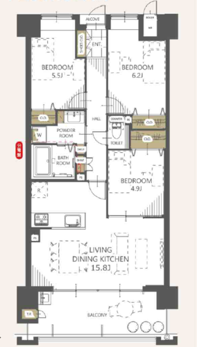 | 専有面積 | 壁芯 74.68㎡ | バルコニー面積 | 13.24㎡ |