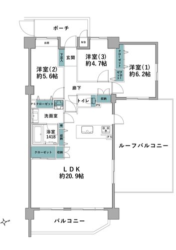 | 浴室・トイレ・洗面所 | 浴室乾燥機 / 浴室1418サイズ / 温水便座洗浄機 / 三面鏡 / シャワー付洗面台 | バルコニー | ルーフバルコニー |