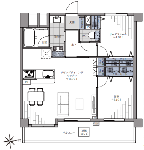 | 専有面積 | 壁芯 61.0㎡ | バルコニー面積 | 10.2㎡ |