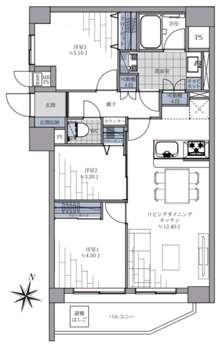 | 専有面積 | 壁芯 59.3㎡ | バルコニー面積 | 7.01㎡ |