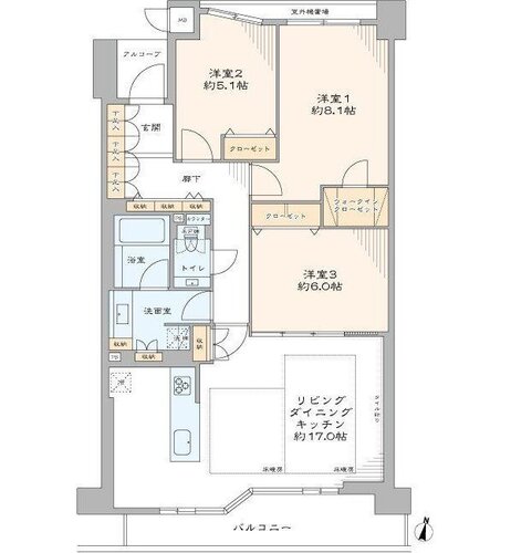 | 間取り | 3LDK + ウォークインクローゼット | 方角 | 南東 |