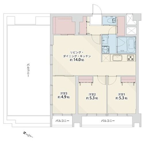 | 浴室・トイレ・洗面所 | 浴室乾燥機 / 追い焚き / 温水便座洗浄機 | バルコニー | 3面バルコニー |