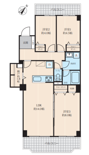 | 専有面積 | 壁芯 74.06㎡ | バルコニー面積 | 14.19㎡ |