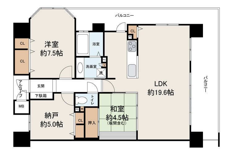 | 浴室・トイレ・洗面所 | 浴室乾燥機 / 浴室に窓 / 温水便座洗浄機 / シャワー付洗面台 | バルコニー | 2面バルコニー / L字バルコニー |
