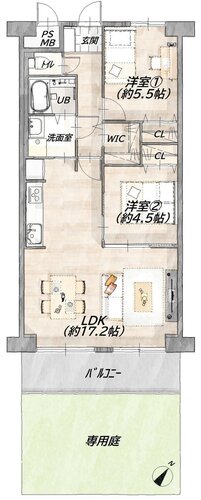 | 間取り | 2LDK + W+専用庭 | 方角 | 南東 |