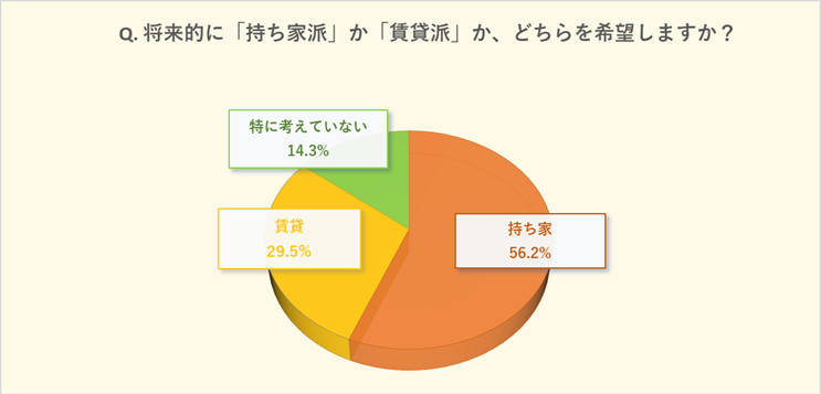 将来的な住まいの話として多くの方が直面する持ち家or賃貸というお悩みについて、「持ち家」が56.2%で過半数を超え、「賃貸」(29.5%)、「特に考えていない」(14.3%)が続きました。現時点の将来設計としては圧倒的に持ち家派が多いようです。