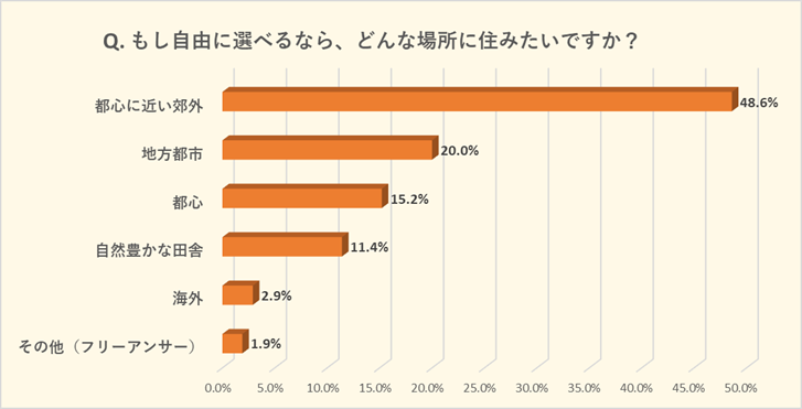 「都心に近い郊外」が最多(48.6%)。次いで「地方都市」(20%)、「都心」(15.2%)となり、“便利さ”と“コストバランス”の両立を求める傾向がうかがえました。都心にアクセスできるエリアにしたいが、経済面との兼ね合いも考える現実的な側面も感じとることができます。