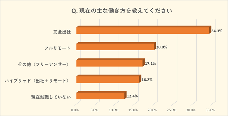 Z世代は「完全出社」(34.3%)が最多ながら、「フルリモート」(20.0%)、「ハイブリッド」(16.2%)も一定数いることから、働き方の多様化が進んでいることがわかります。
